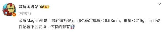 图片显示,这款手机主打轻薄,博主@数码闲聊站 的爆料中提到,“荣耀Magic V5是「最轻薄折叠」,那么确定厚度<8.93mm,重量<219g,而且硬件配置不会妥协,该有的都有”。