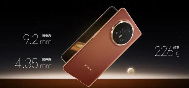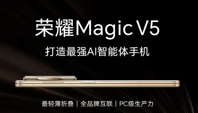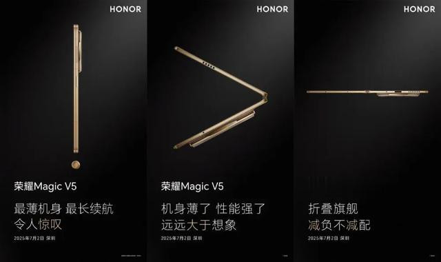 今日上午,荣耀手机官方发布了旗下待发布新机 Magic V5 的三张图片,号称其为一款“减负不减配”的折叠旗舰,拥有“最薄”机身和“最长”续航。