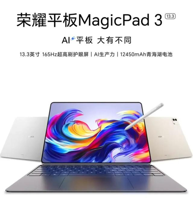再来看此次荣耀的全新平板,相较于上一代,MagicPad 3 可以说在 AI 驱动的体验上进一步深挖,官方称为“最佳 AI 平板”。 具体来看,全新荣耀 MagicPad 3 拥有月影白、浮光金、星空灰三种配色,配备13.3英寸LCD绿洲护眼大屏,搭载骁龙 8 Gen3 处理器、提供 16GB LPDDR5X+1TB UFS 规格版本,内置12450mAh电池,机身厚5.79mm,重量为595g。